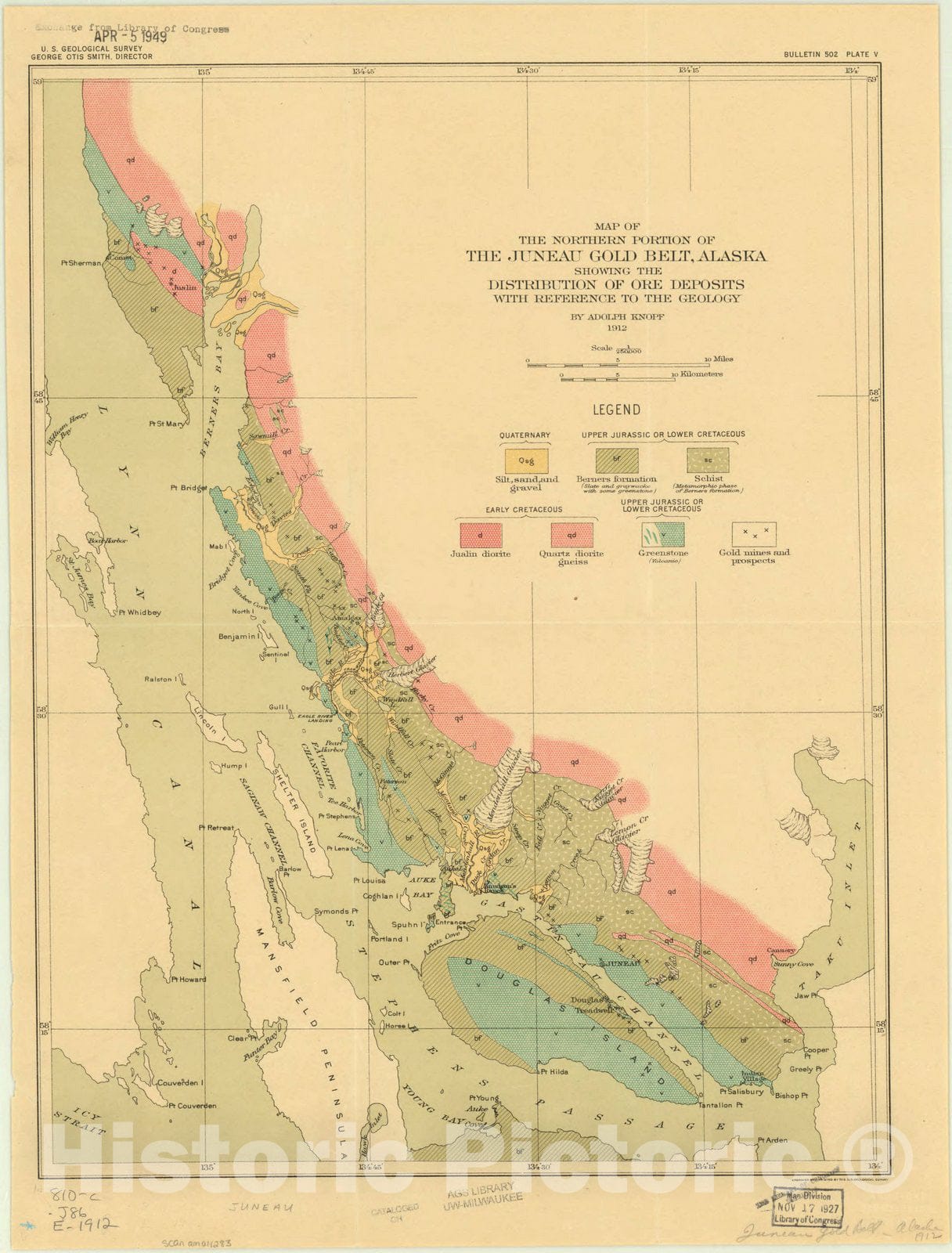 Map of the northern portion of the Juneau gold belt, Alaska : showing the distribution of ore deposits with reference to the geology / by Adolph Knopf