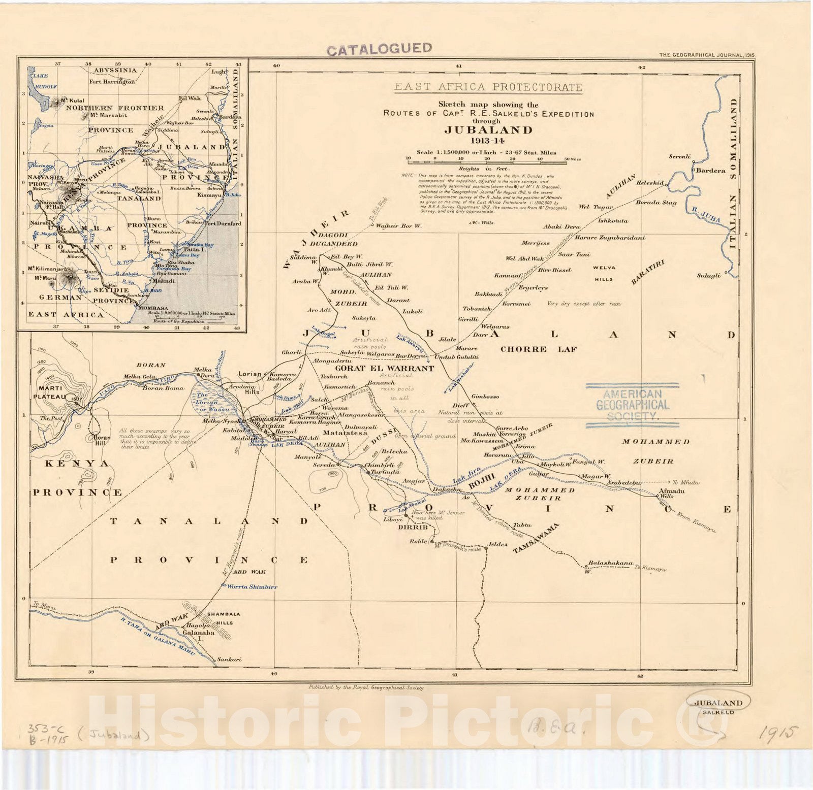 East Africa Protectorate, sketch map showing the routes of capt. R.E. Salkeld's expedition through Jubaland 1913-14. Jubaland, Salkeld / published by the Royal Geographical Society