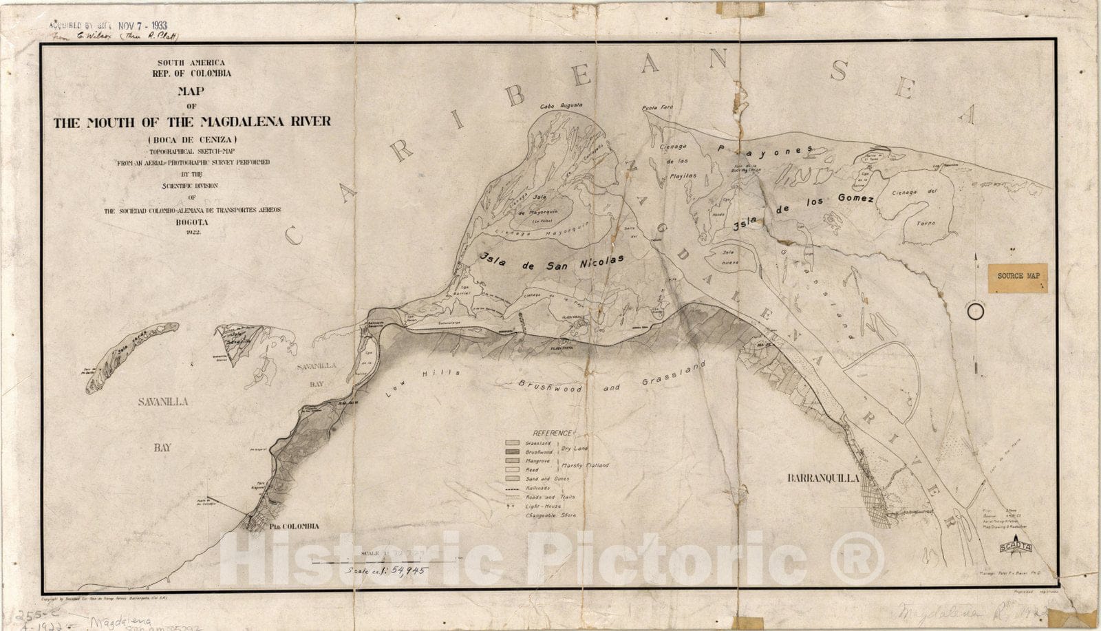Map : Magdalena River, Colombia 1922, Map of the mouth of the Magdalena River (Boca de Ceniza) topographical sketch map , Antique Vintage Reproduction