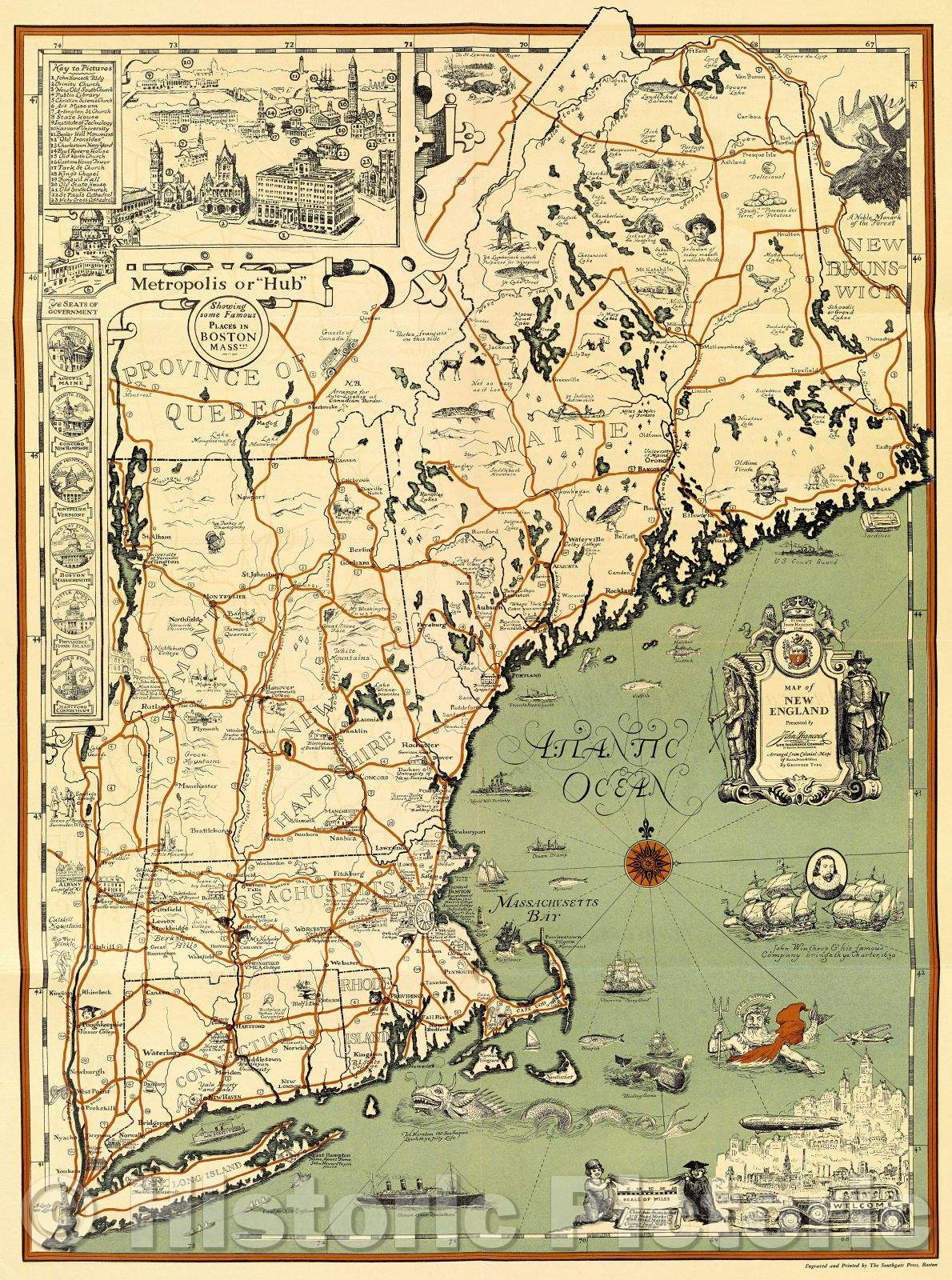 Historic Map : Map of New England with chief auto-routes, 1930 , Vintage Wall Art