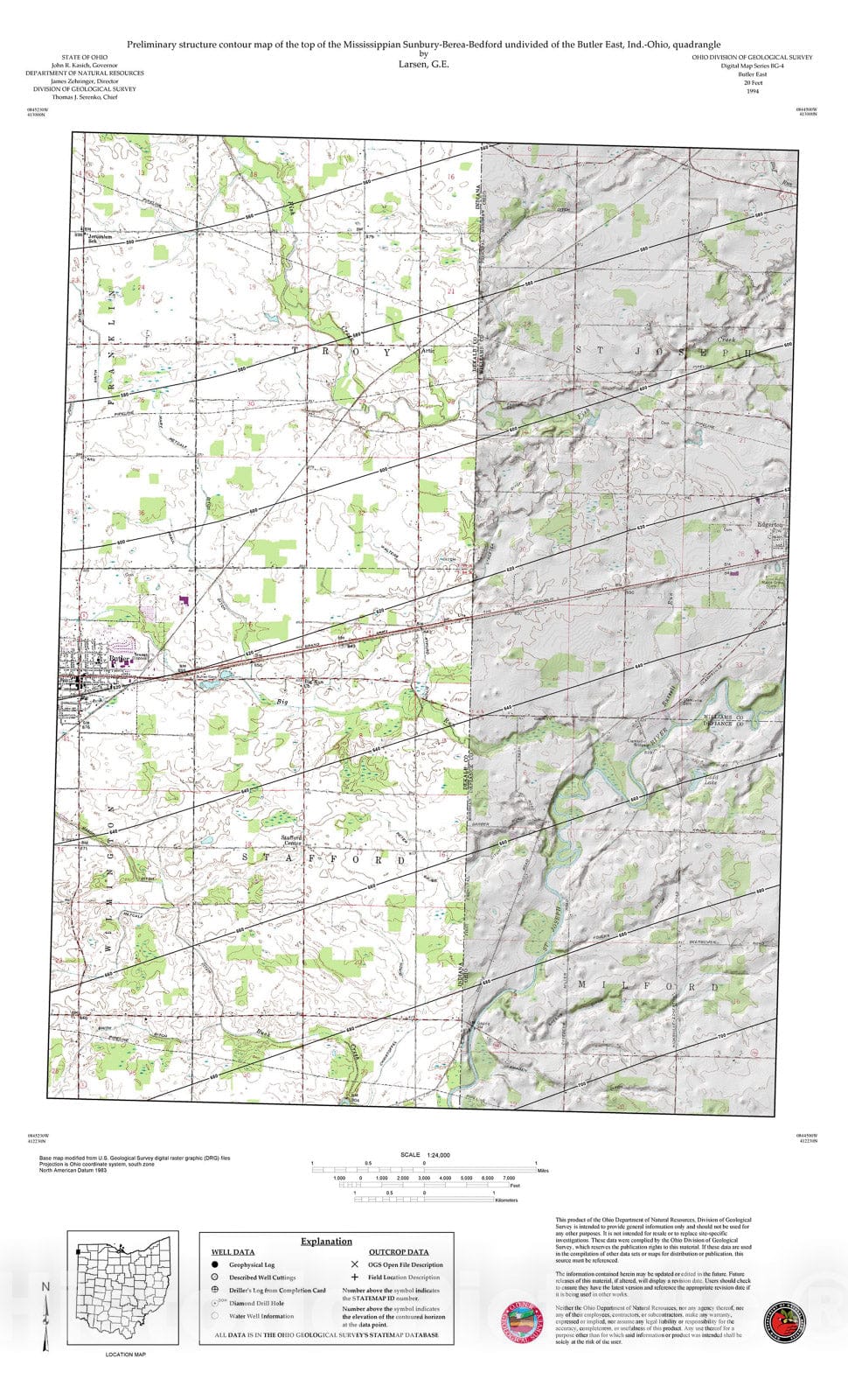 Map : Preliminary structure contour map of the top of the Mississippian Sunbury-Berea-Bedford undivided of the Butler East, Ind.-Ohio, quadrangle, 1994 Cartography Wall Art :