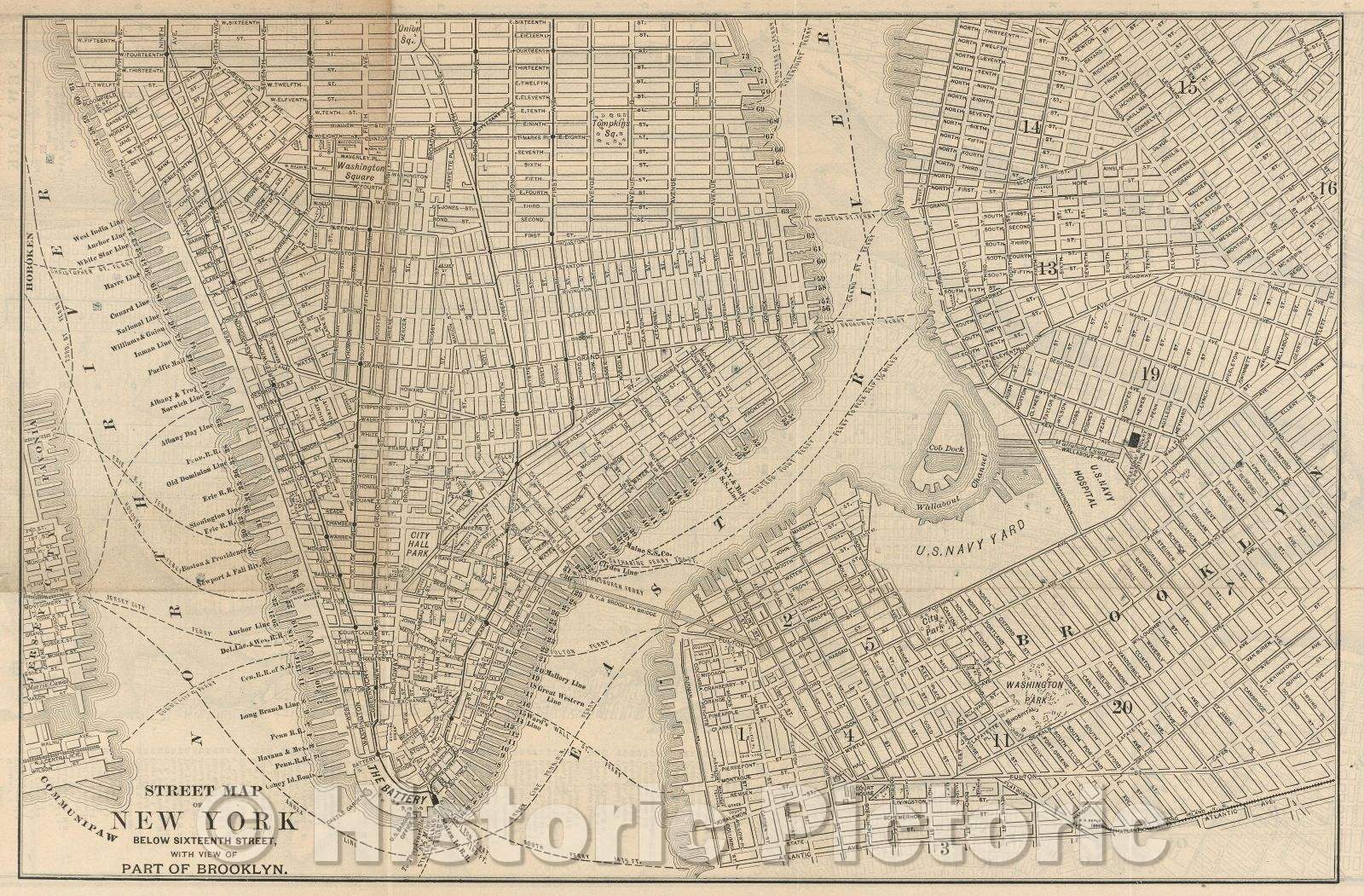 Historic Map : Street Map of New York below Sixteenth Street, with view of part of Brooklyn., c. 1910 , Vintage Wall Art