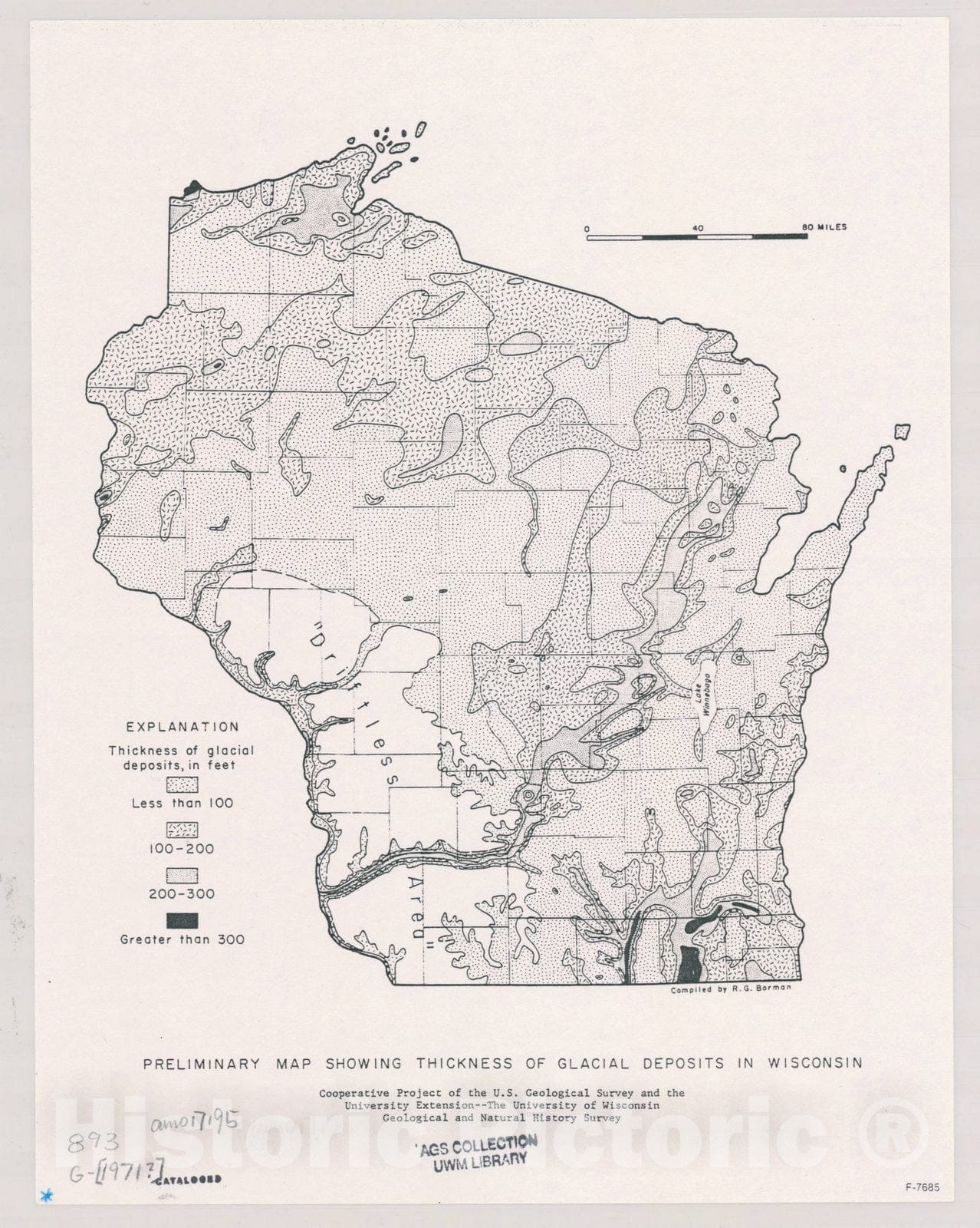 Preliminary map showing thickness of glacial deposits in Wisconsin / compiled by R.G. Borman ; cooperative project of the U. S. Geological Survey and the University Extension-the University of Wisconsin, Geological and Natural History Survey