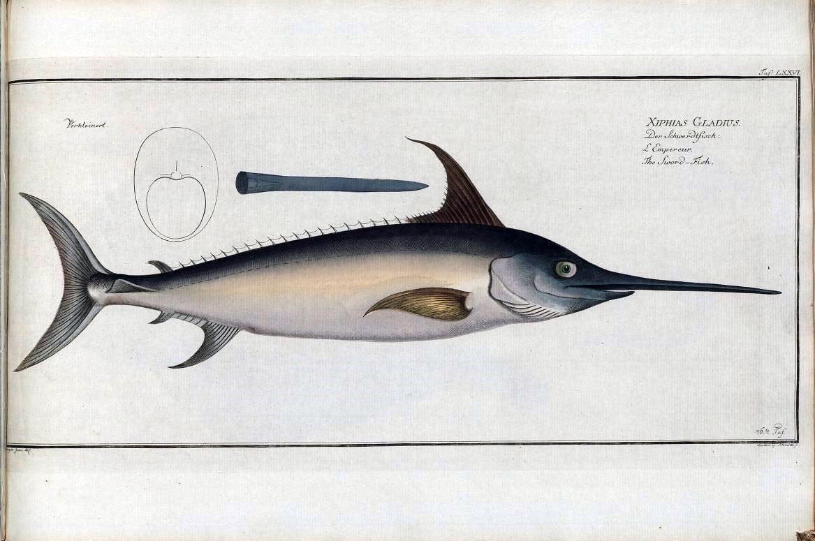 D. Marcus Elieser Bloch's, ausübenden Arztes zu Berlin . Oeconomische Naturgeschichte der Fische Deutschlands . .Berlin :Auf Kosten des Verfassers und in Commission bei dem Buchhändler Hr. Hesse,1782-1795. |1782-1784 Berlin "Early works" "Early works to 1800" Engravings Fishes Germany "Hand coloring" Ichthyology "Pictorial works" "Subscription lists (Publishing)" Zoology "Harvard University, Museum of Comparative Zoology, Ernst Mayr Library" |Fish Swordfish | taxonomy:binomial=Xiphias gladius | taxonomy:common=swordfish