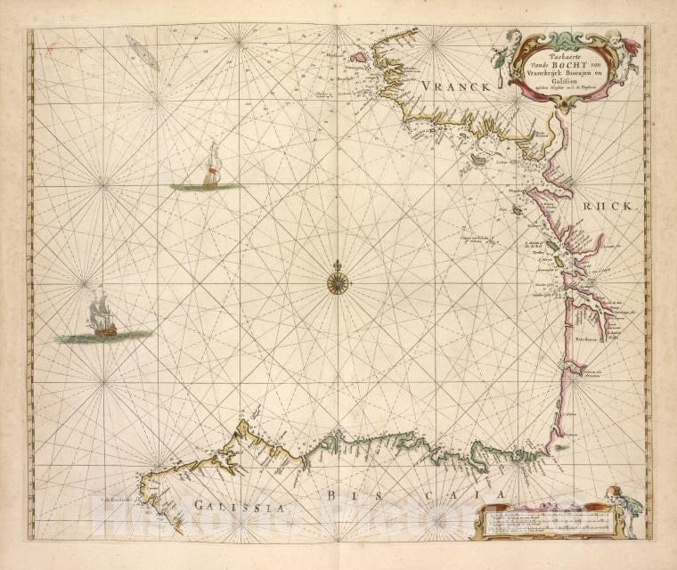 Historic Map - 1672 Biscay, Bay Of (France And Spain), Paskaerte Van De Bocht Van Vranckrijck, Biscajen En Galissen Tusschen Heysant En C. De Finisterre - Vintage Wall Art