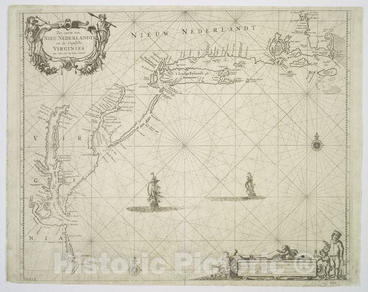 Historic Map - 1676 New England, Pas Caerte Van Nieu Nederlandt En De Engelsche Virginies : Van Cabo Cod Tot Cabo Canrick - Vintage Wall Art