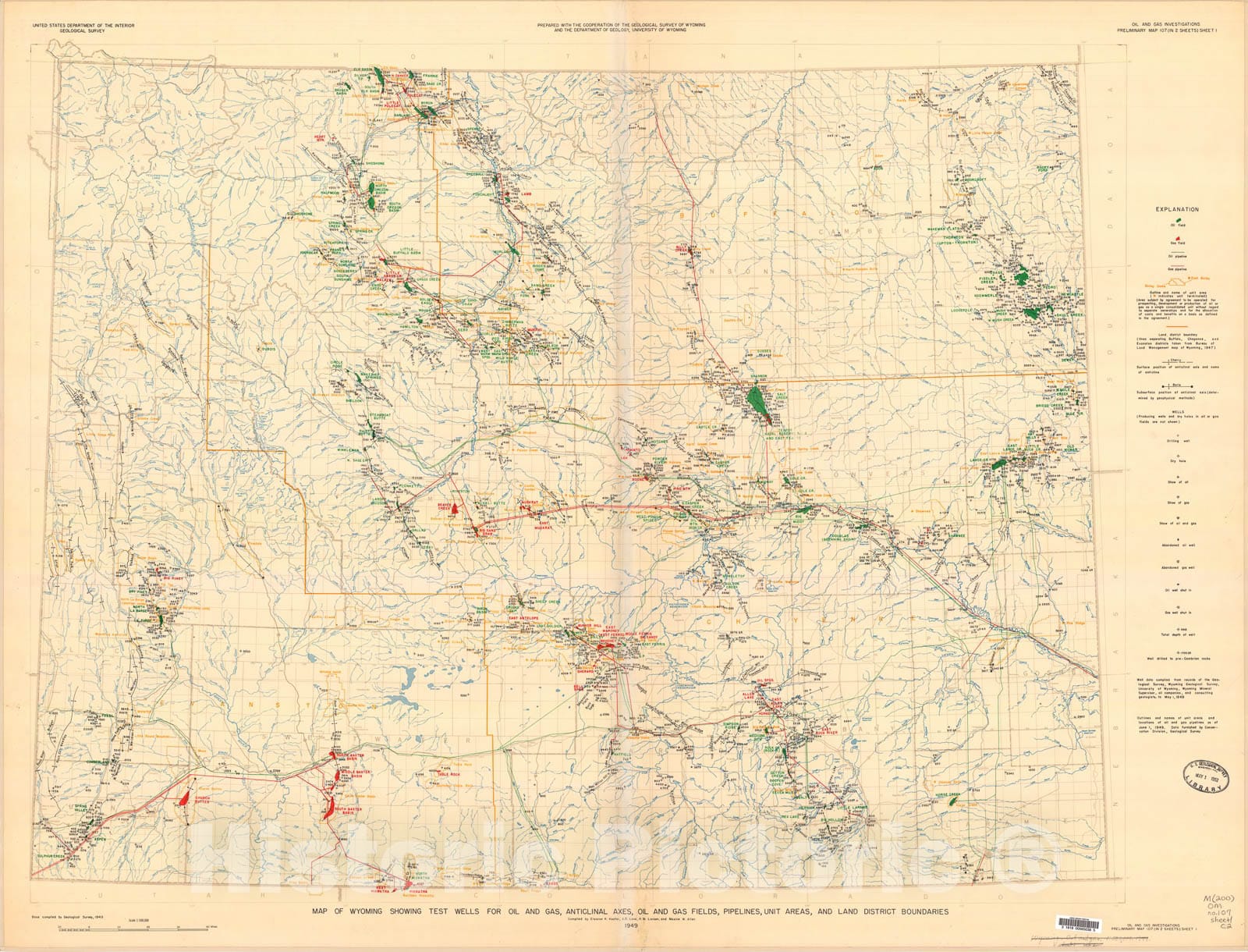 Map : Map of Wyoming showing test wells for oil and gas, anticlinal axes, oil and gas fields, pipelines, unit areas, and land district boundaries, 1949 Cartography Wall Art :