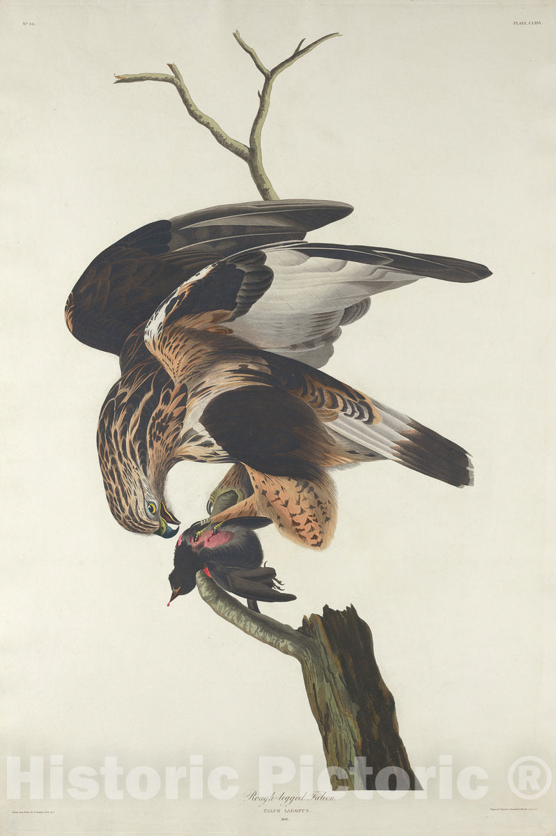 Rough-Legged Falcon, from Birds of America by John James Audubon, etched by Robert Havell. Birds of America is a book by naturalist and painter John James Audubon, containing colorfull illustrations of birds of the United States, first published in Edinburgh and London in 1827. The book consists of 435 hand-coloured prints made from engraved plates. It includes images of six, now-extinct birds. Art historians describe Audubon's work as printed with "artistic finesse". Audubon also authored the companion book Ornithological Biographies, The original Birds of America is the most valuable printed book's available and is highly prized by rare book collectors.