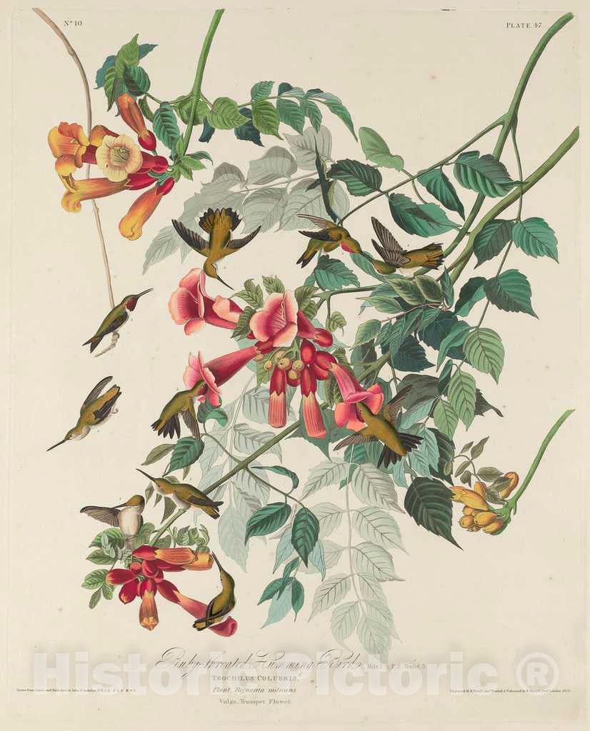 Ruby-Throated Humming Bird, from Birds of America by John James Audubon, etched by Robert Havell. Birds of America is a book by naturalist and painter John James Audubon, containing colorfull illustrations of birds of the United States, first published in Edinburgh and London in 1827. The book consists of 435 hand-coloured prints made from engraved plates. It includes images of six, now-extinct birds. Art historians describe Audubon's work as printed with "artistic finesse". Audubon also authored the companion book Ornithological Biographies, The original Birds of America is the most valuable printed book's available and is highly prized by rare book collectors.