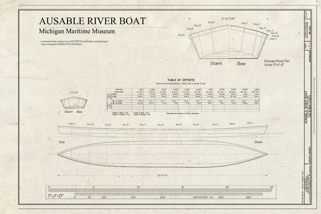 Blueprint 1. Plans and offsets Table - Au Sable River Boat, Michigan Maritime Museum, South Haven, Van Buren County, MI