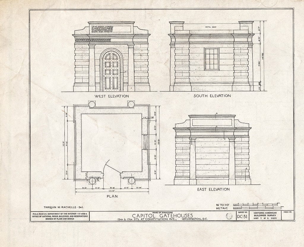 Blueprint 1. Elevations and Plan - U.S. Capitol Gatehouses, Fifteenth & Seventeenth Streets at Constitution Avenue, Washington, District of Columbia, DC