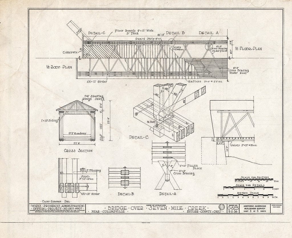 Blueprint 1/2 Roof Plan, 1/2 Floor Plan, Cross Section, Details - Covered Bridge, Spanning Seven Mile Creek, Collinsville, Butler County, OH
