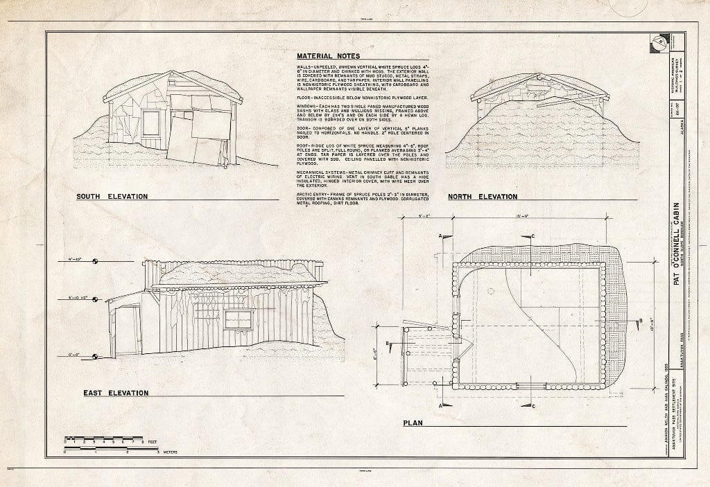 Blueprint 1. South, North, and East elevations; Plan; Material Notes - Pat O'Connell Cabin, 330 Mekiana Road, Anaktuvuk Pass, North Slope Borough, AK