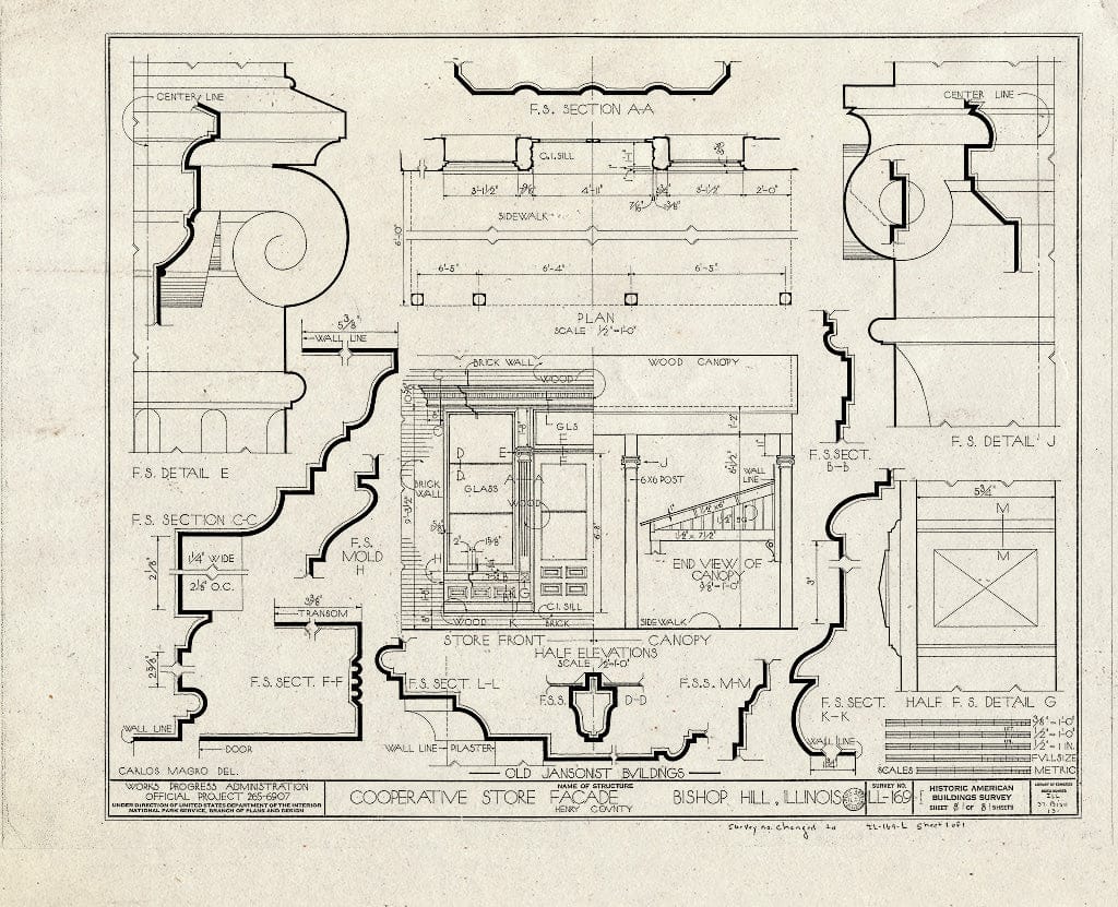 Blueprint 1. Store Front Half Elevation and Details - Jansonist Colony, Cooperative Store, Main & Christina Streets, Bishop Hill, Henry County, IL