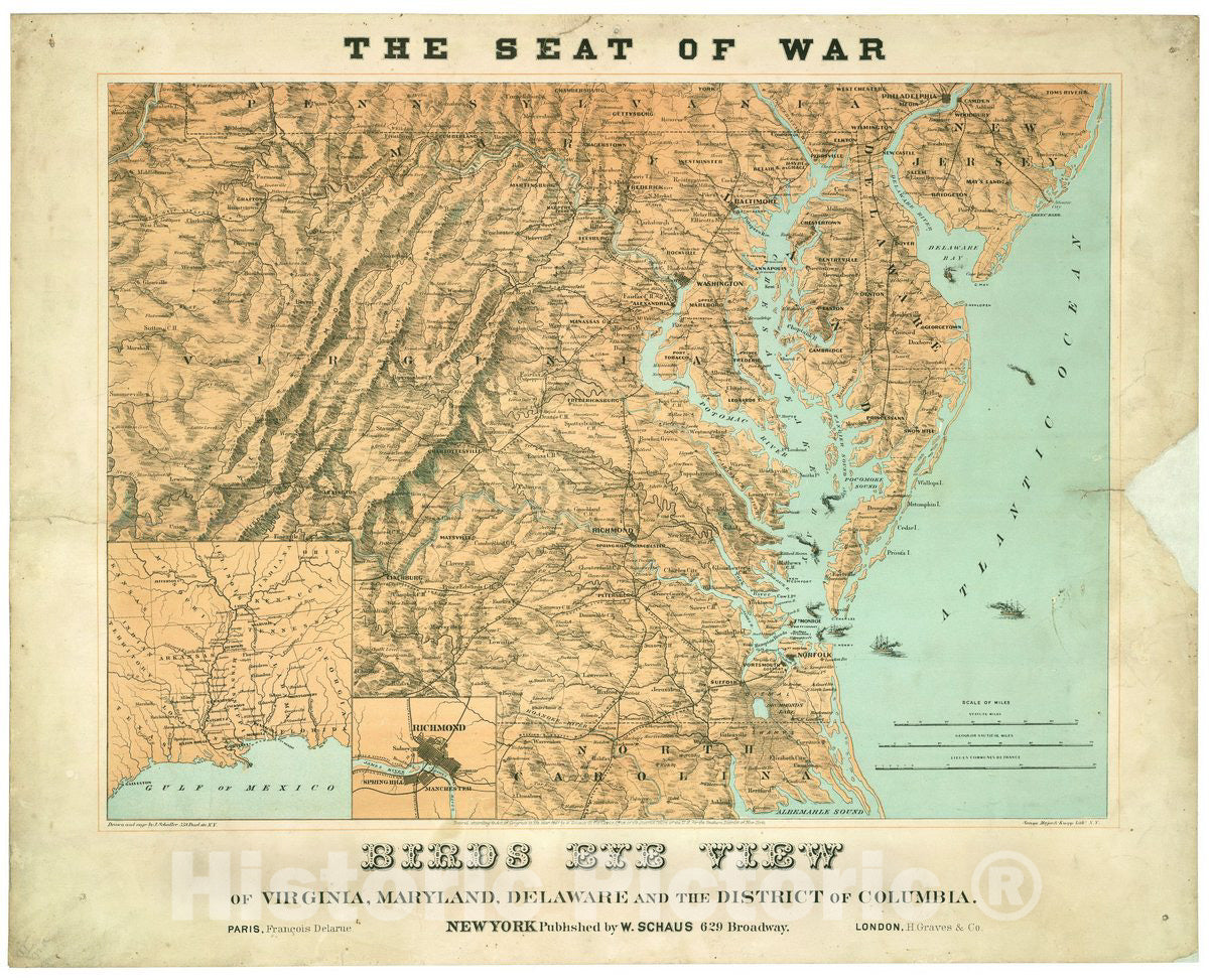 • Historic 1861 Map - Birds Eye View of Virginia, Maryland, Delaware, and The District of Columbia The seat of war