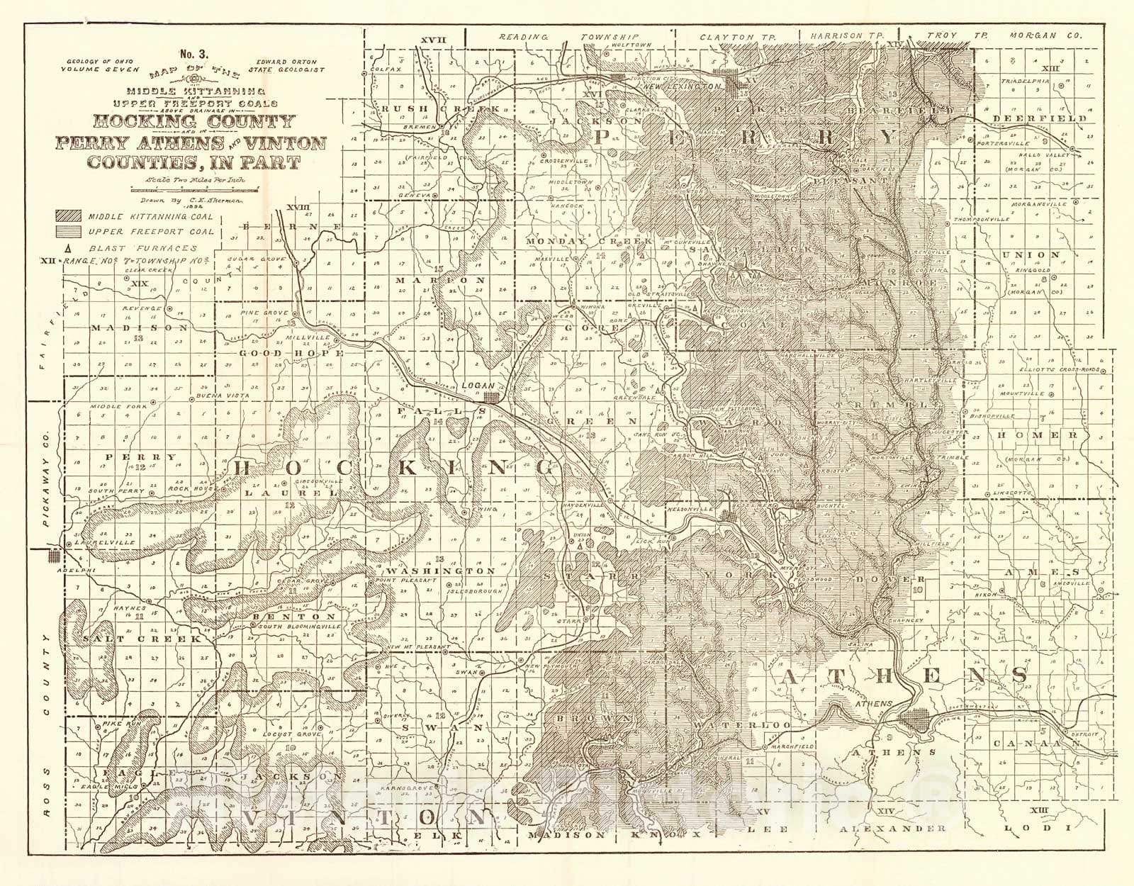 Vintage Map | 1892 Map of the Middle Kittanning and Upper Freeport Coals above drainage in Hocking County and in Perry, Athens and Vinton Counties in part | Sherman, C.E.