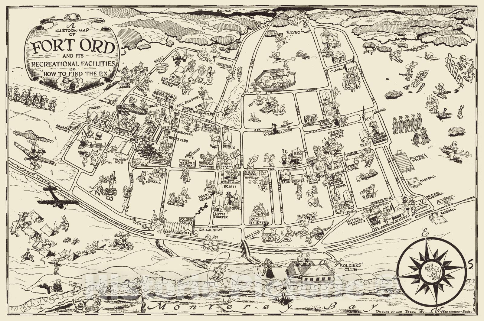 • .Historic Map - A Cartoon map of Fort Ord and its recreational facilities, 1949 - Vintage Wall Art