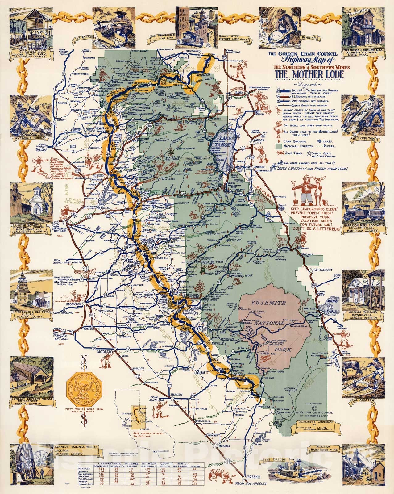 • .Historic Map - Golden Chain Council: Highway map of the northern & southern mines of Mother Lode, 1960 - Vintage Wall Art