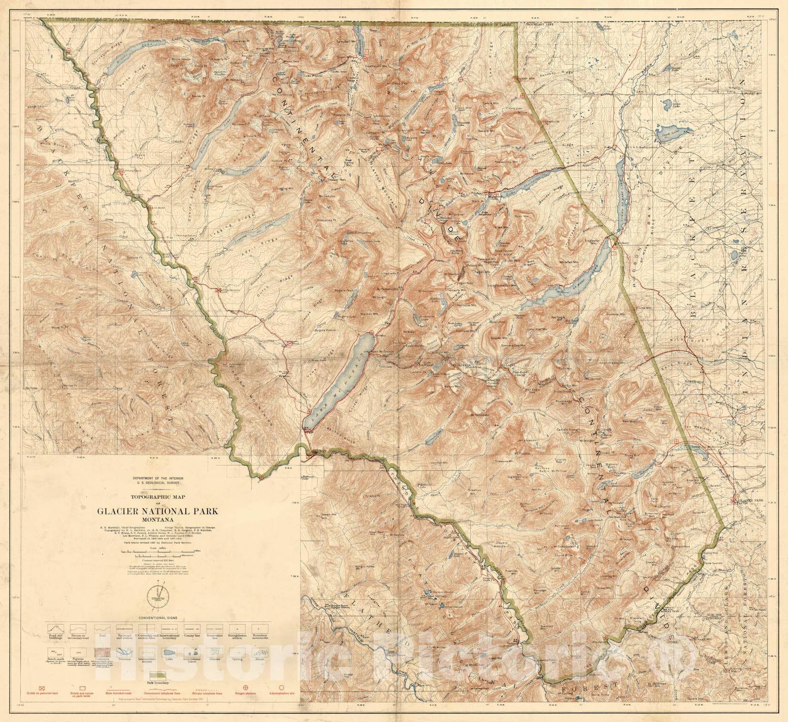 Historic Map - Topographical Map of Glacier National Park Montana, 1914, U.S. Geological Survey - Vintage Wall Art