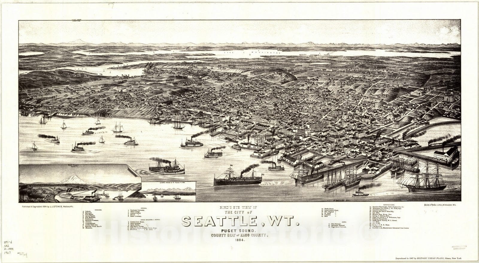 Historic Map : Seattle, , Bird's eye view of the city of Seattle, W.T., Puget Sound, county seat of King County 1884. H. Wellge, del. Beck & Pauli, litho, Antique Vintage Reproduction