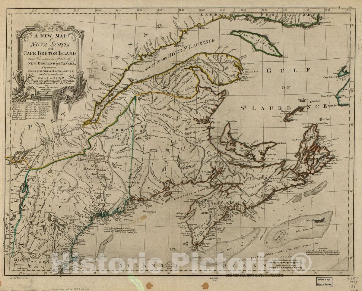• Historic 1775 Map - A New map of Nova Scotia, and Cape Breton Island with The Adjacent Parts of New England and Canada, Composed from a Great Number of Actual surveys