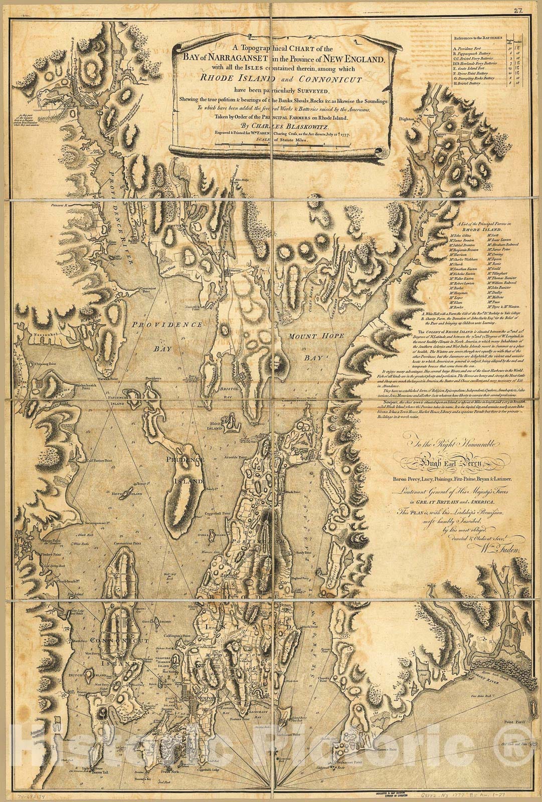 Historic 1777 Map - A Topographical Chart of The Bay of Narraganset in The Province of New England, with All The Isles contained therein, Among which Rhode Island and Connonicut