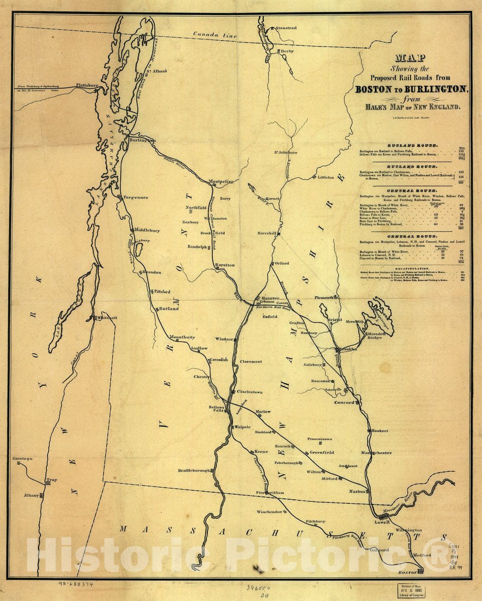 Historic 1844 Map - Map Showing The Proposed Rail Roads from Boston to Burlington, from Hale's map of New England.
