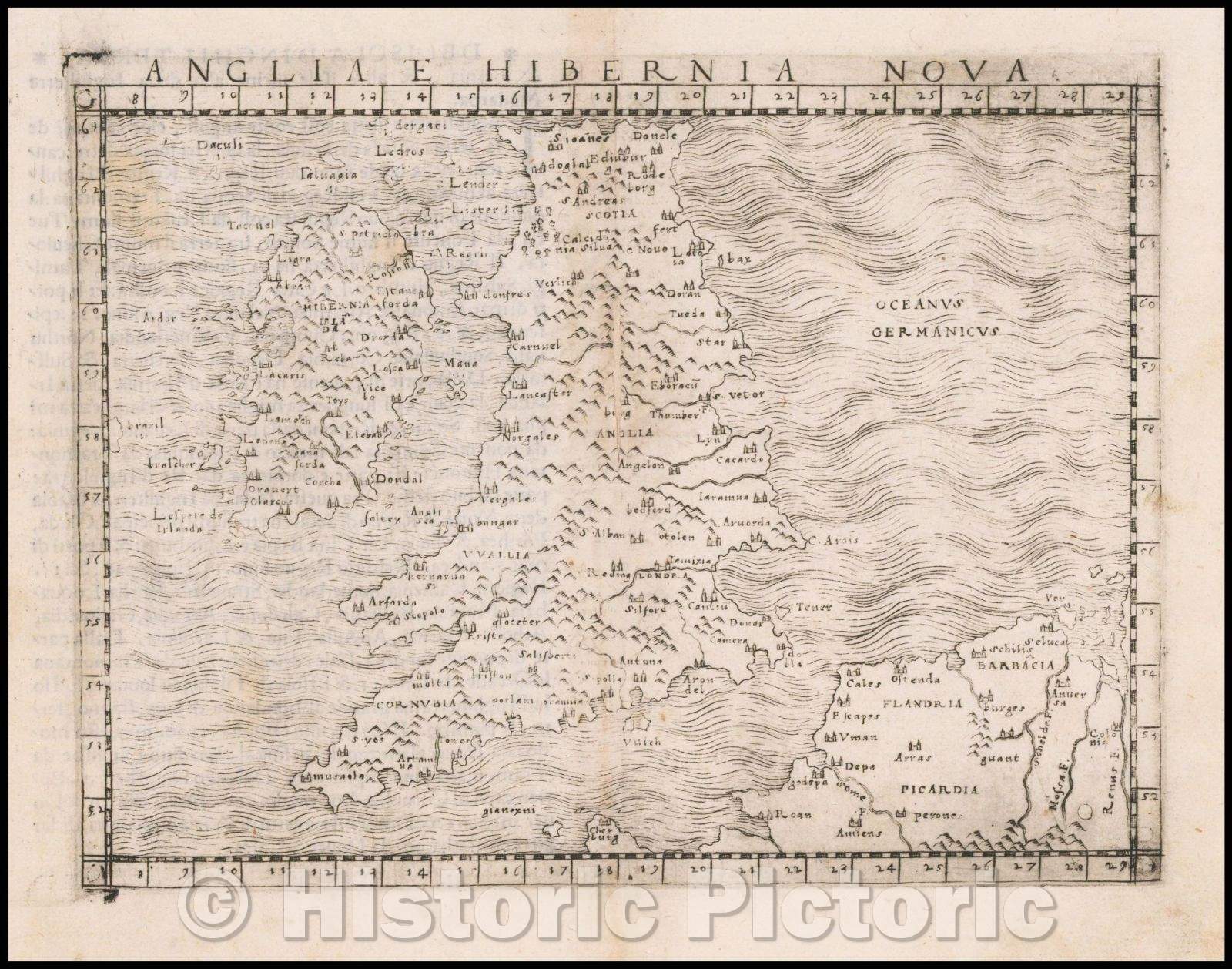• .Historic Map - Anglia E Hibernia Nova/New England E Ireland, 1548, Giacomo Gastaldi - Vintage Wall Art