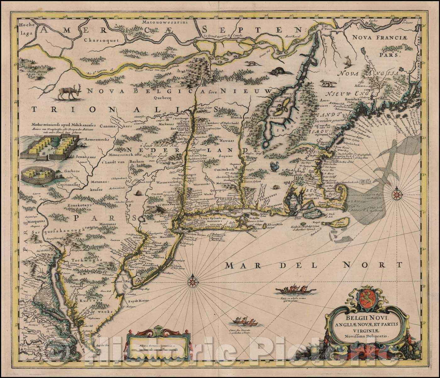 • .Historic Map - Belgii Novi Angliae Novae et Partis Virginiae Novissima Delineatio/Part of Virginia, New England and the Netherlands, New Brazil Brazil, 1650 - Vintage Wall Art