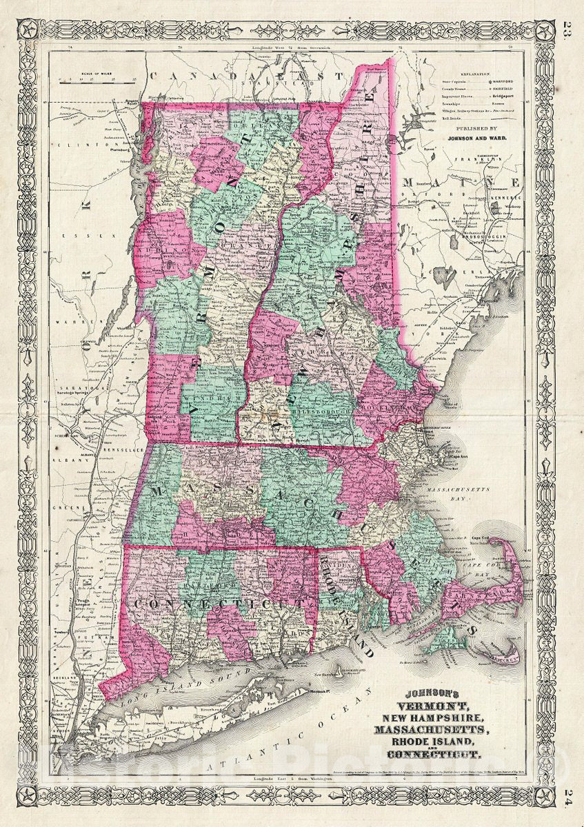 Historic Map : Johnson Map of New England: Maine, Vermont, New Hampshire, Massachusetts, Connecticut, 1864, Vintage Wall Art