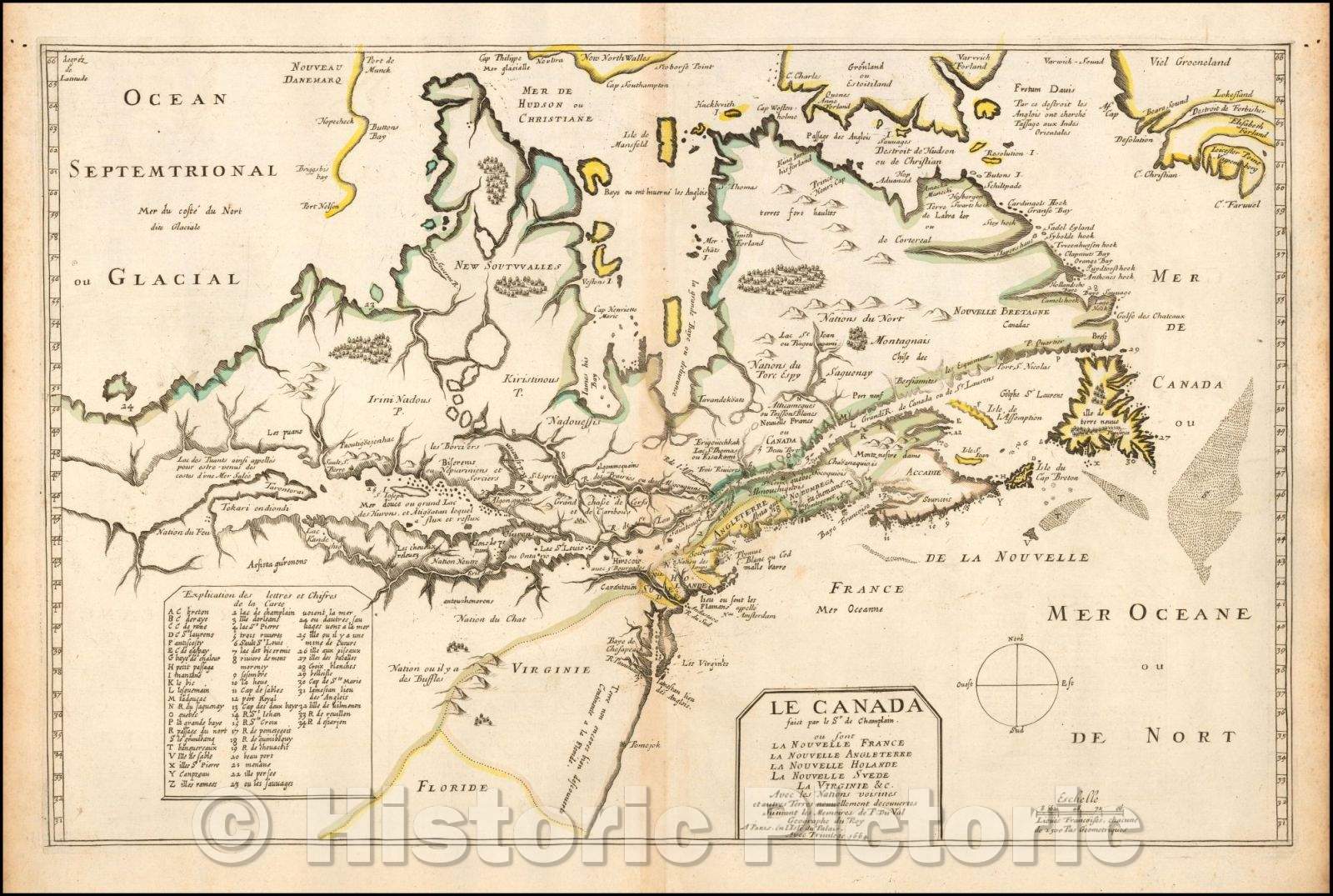 Historic Map - Le Canada faict par le Sr. de Champlain. ou sont La Nouvelle France, La N :: Canada deed, New France, New England, New Holande, 1664 - Vintage Wall Art