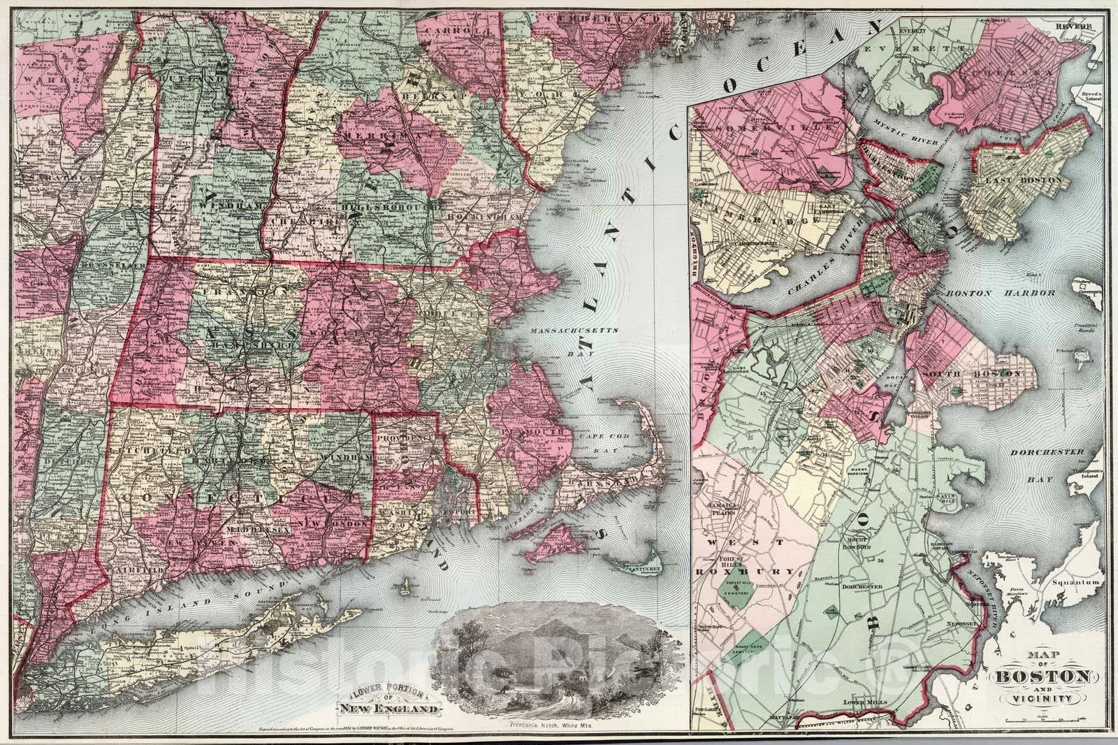 Historic Map : Lower Portion of New England. Map of Boston and Vicinity, 1874 - Vintage Wall Art