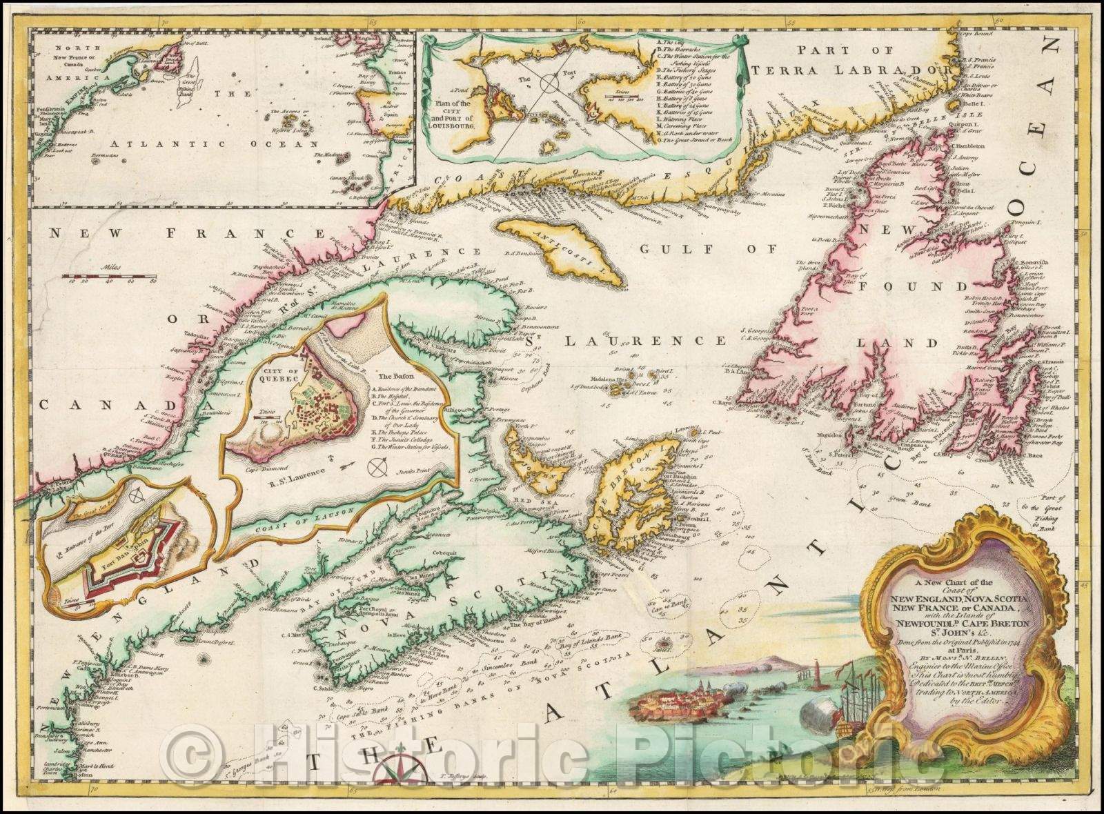• .Historic Map - A New Chart of the Coast of New England, Nova Scotia, New France or Canada with the Islands of Newfoundland. Cape Breton St. John &c, 1746 - Vintage Wall Art