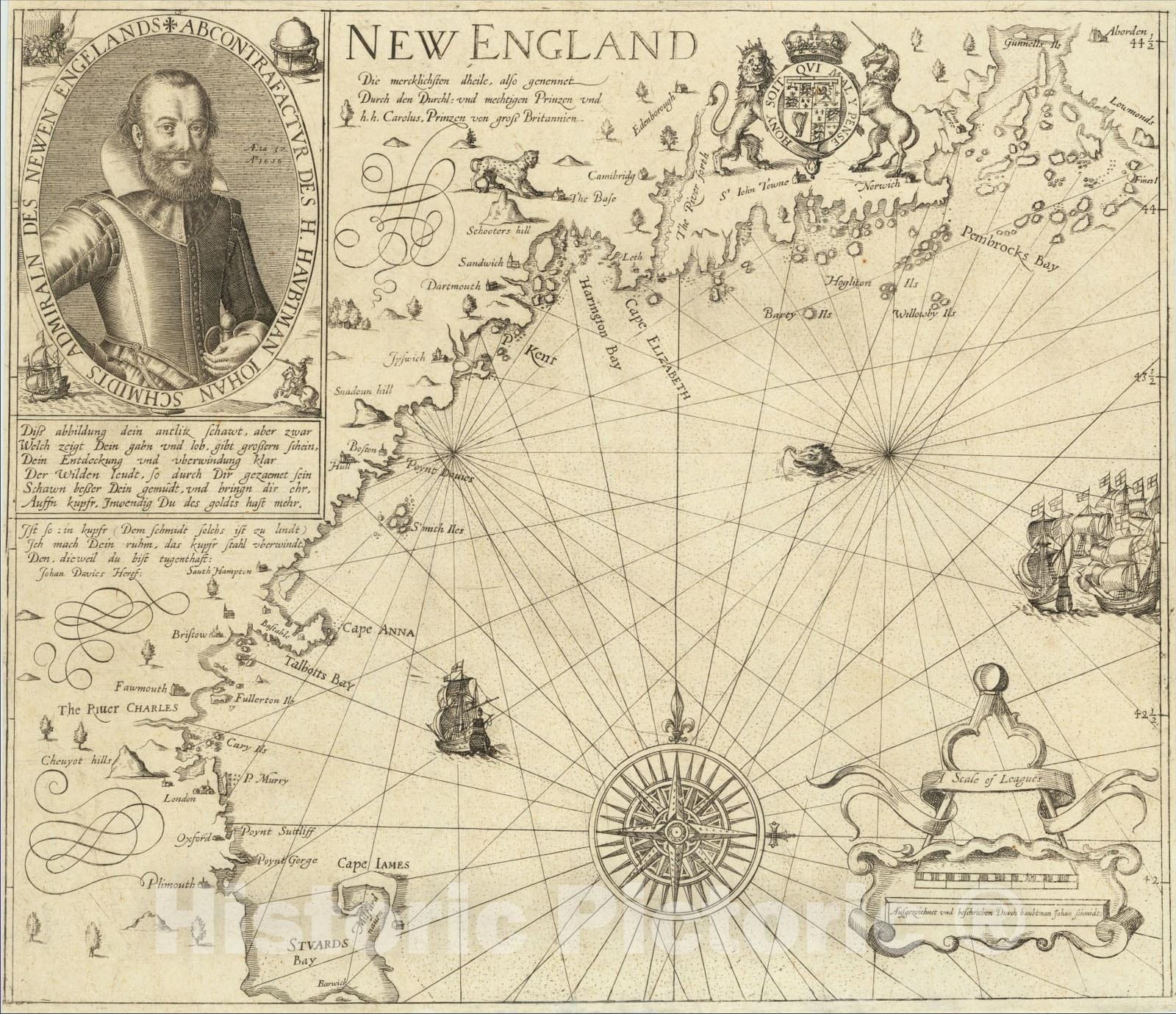 • Historic Map : New England. Die Mercklichsten Dheile, also Genennet durch den Durchl, 1617, John Smith - Levinus Hulsius, Vintage Wall Art