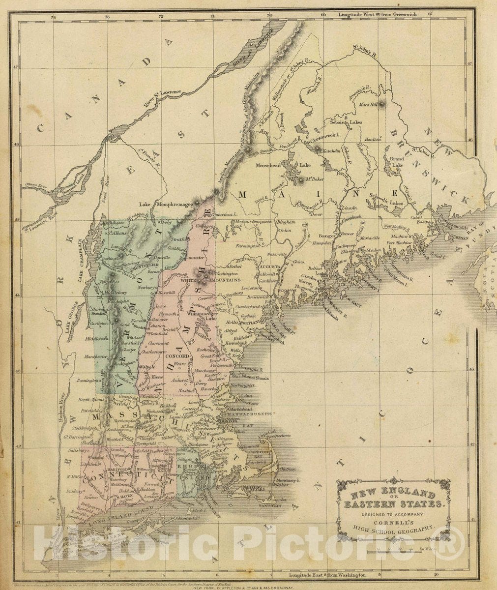 Historic Map : New England or Eastern States. Designed to accompany Cornell's High School Geography, 1864 Atlas - Vintage Wall Art