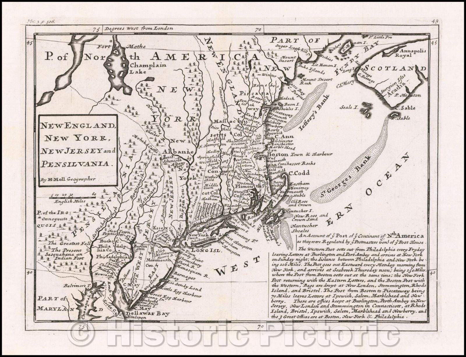 Historic Map - New England, New York, New Jersey and Pensilvania (First map to show American post roads), 1729, - Vintage Wall Art