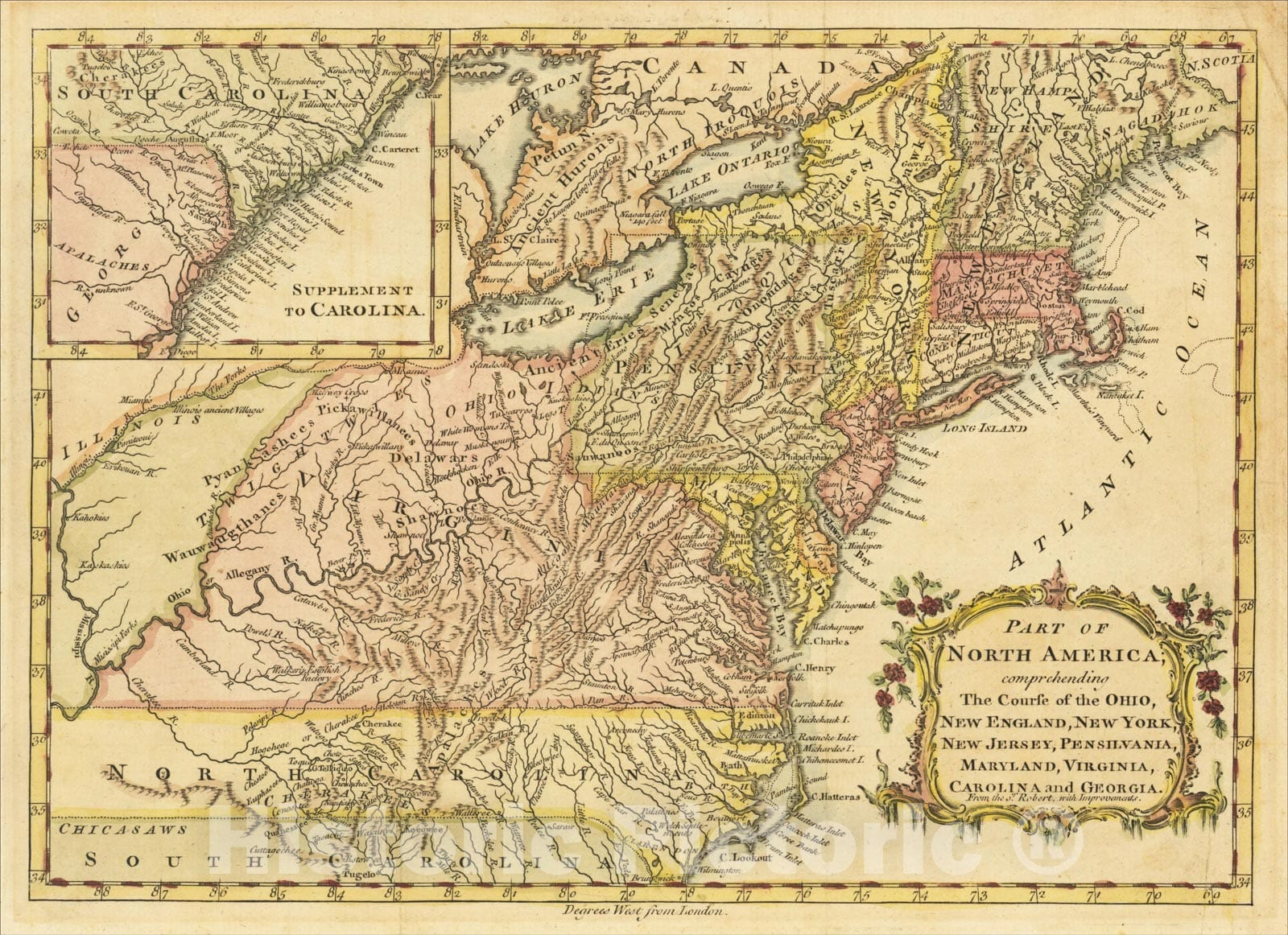 Historic Map : Part of North America; Course of the Ohio, New England, New York, New Jersey, Pensilvania, Maryland, Virginia, Carolina and Georgia, 1759, Vintage Wall Art