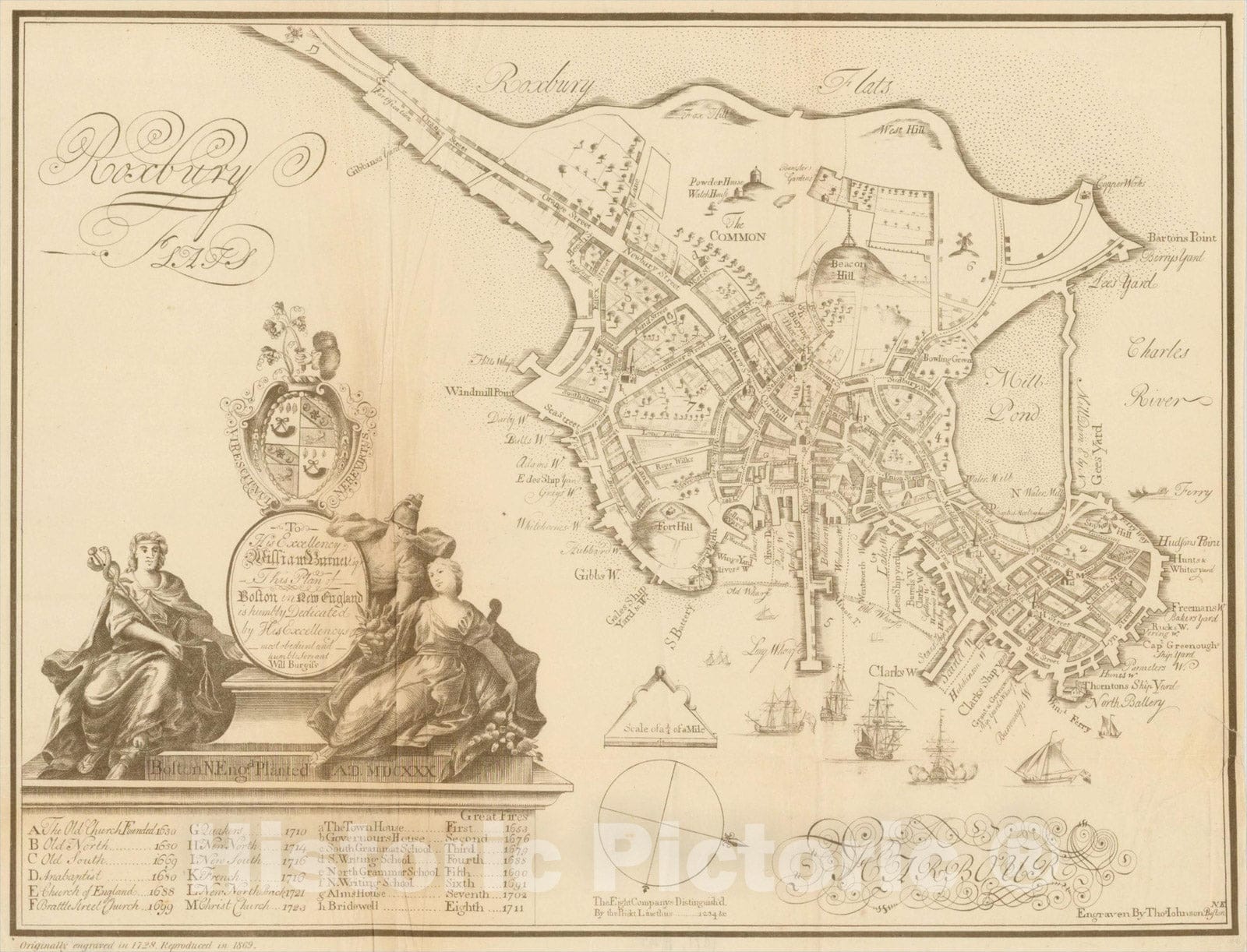 Historic Map : Plan of Boston in New England, c1728, William Burgis, Vintage Wall Art