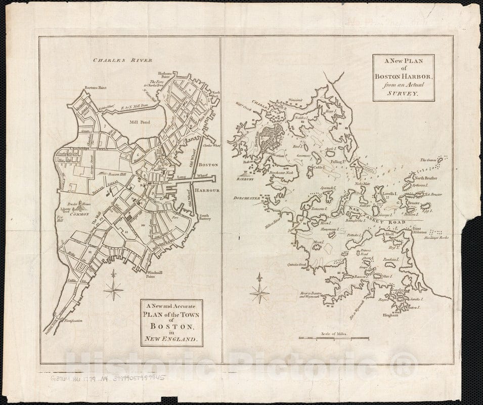 Historical Map, 1774 A New and Accurate Plan of The Town of Boston in New England : A New Plan of Boston Harbor from an Actual Survey, Vintage Wall Art