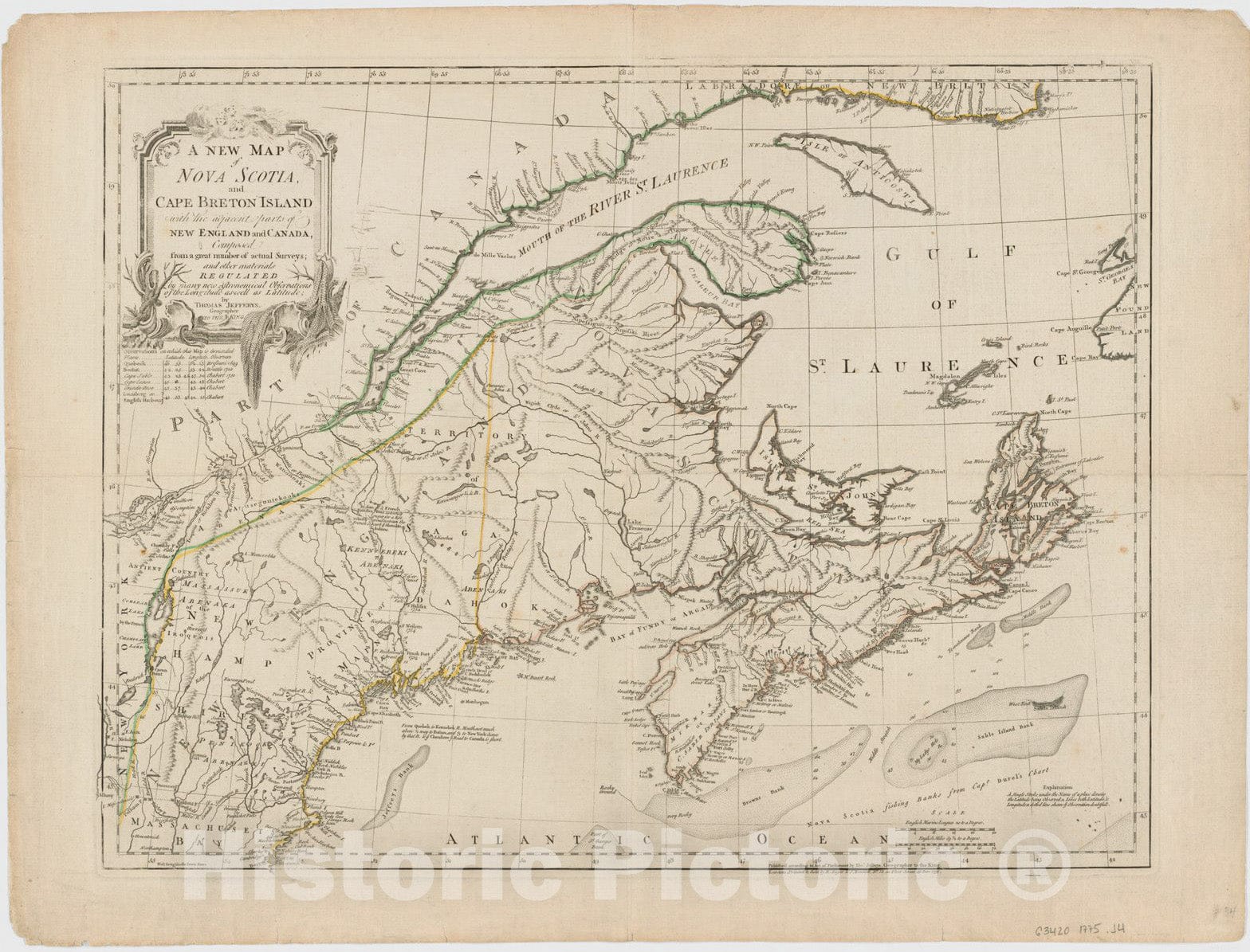 Historical Map, 1775 A New map of Nova Scotia and Cape Breton Island : with The Adjacent Parts of New England and Canada Composed from a Great Number of Actual surveys, Vintage Wall Art