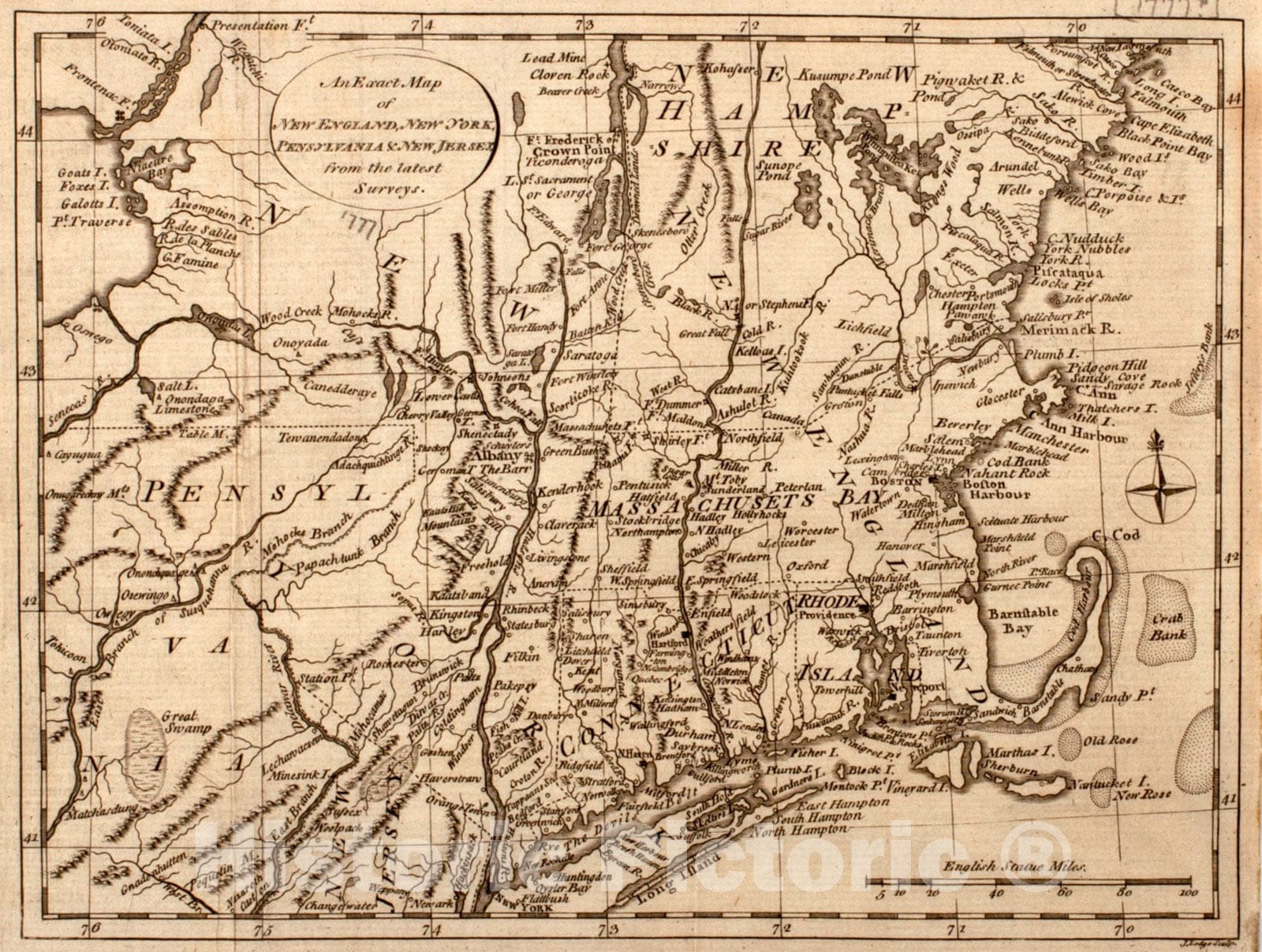 Historical Map, 1778 an Exact map of New England, New York, Pensylvania & New Jersey, from The Latest surveys, Vintage Wall Art