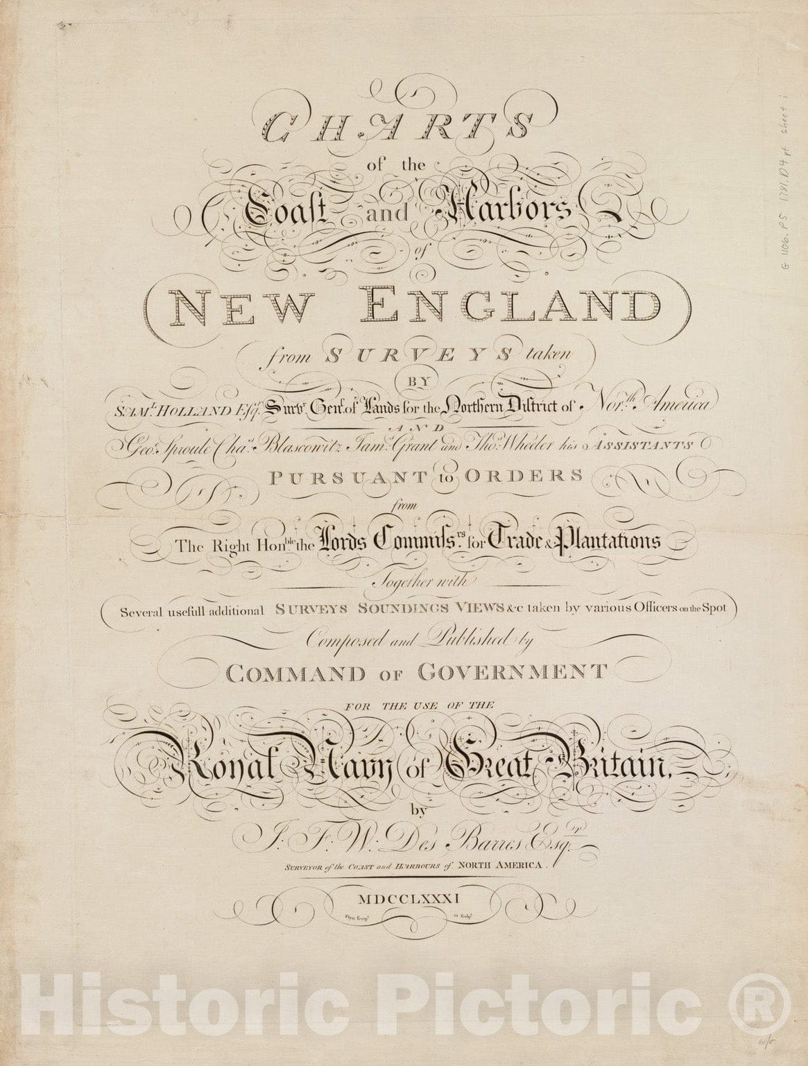 Historical Map, 1781 Charts of The Coast and Harbors of New England : [Title Page], Vintage Wall Art