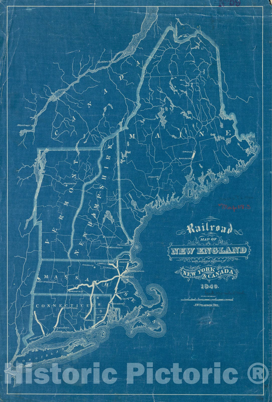 Historical Map, 1840 Railroad map of New England, with Adjacent portions of New York & Canada, Vintage Wall Art