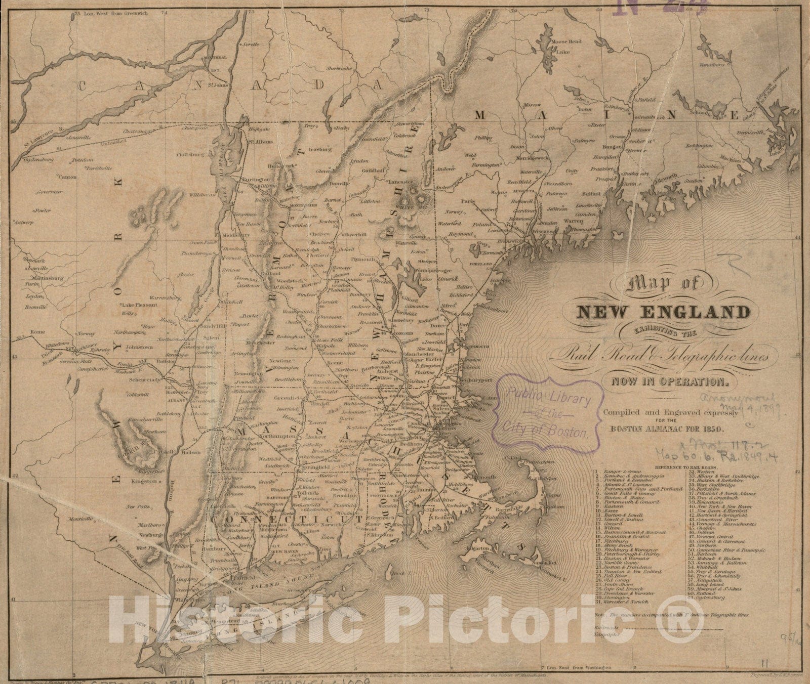 Historical Map, 1849 Map of New England exhibiting The Rail Road & telegraphic Lines Now in Operation, Vintage Wall Art