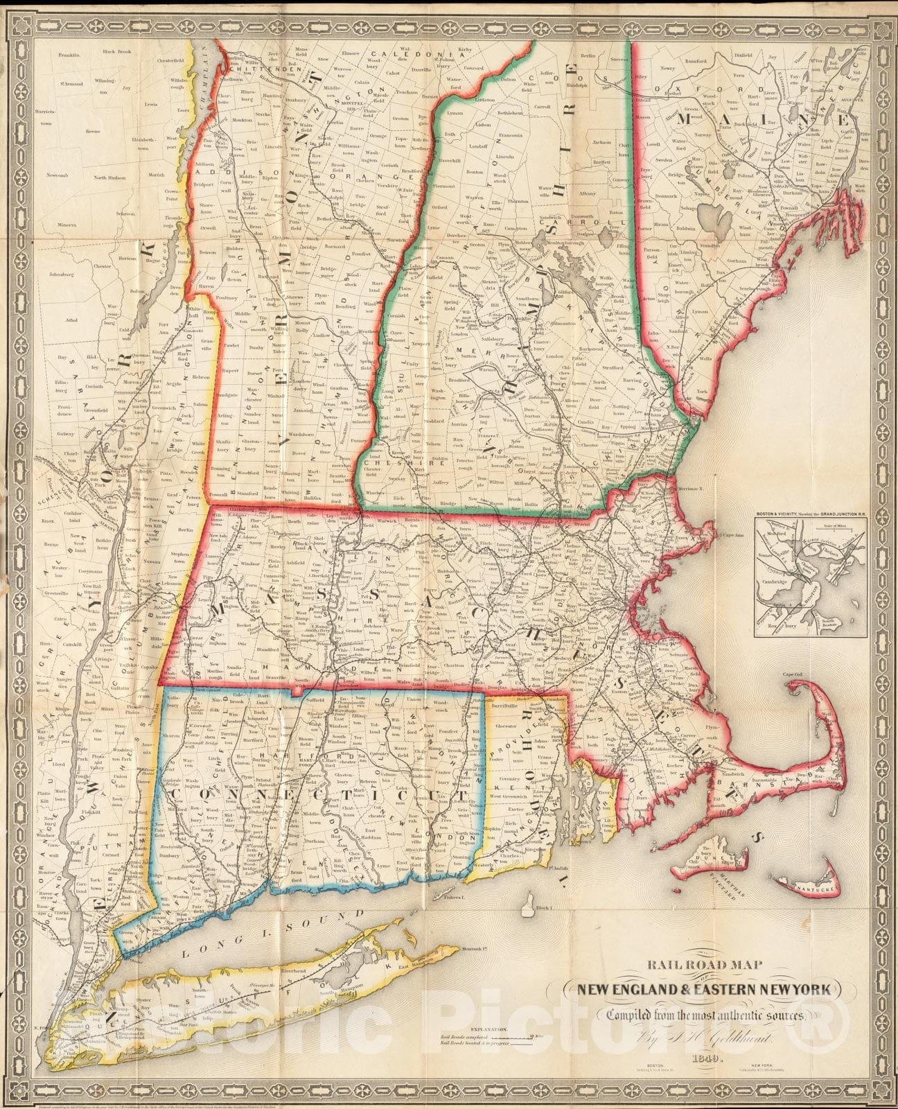 Historical Map, 1849 Railroad map of New England & eastern New York complied from the most authentic sources, Vintage Wall Art