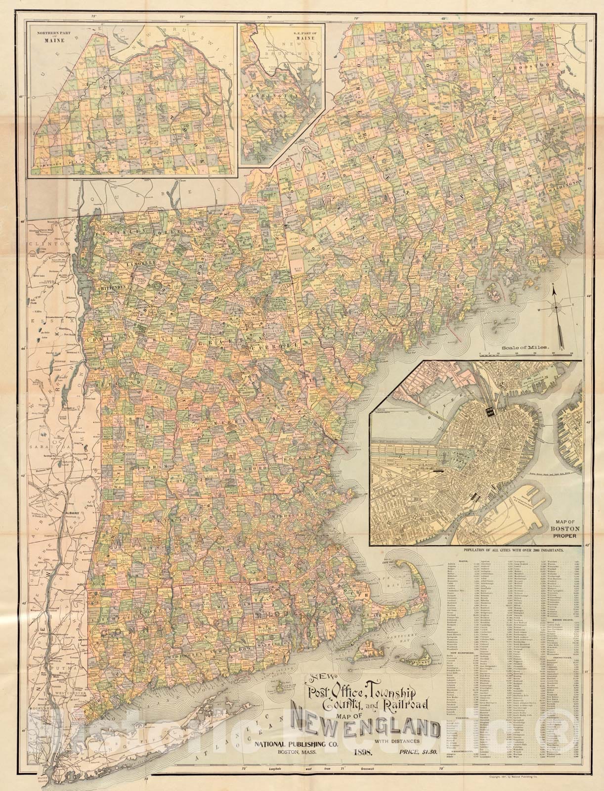 • Historical Map, 1898 New post office, township, county and railroad map of New England : with distances, Vintage Wall Art