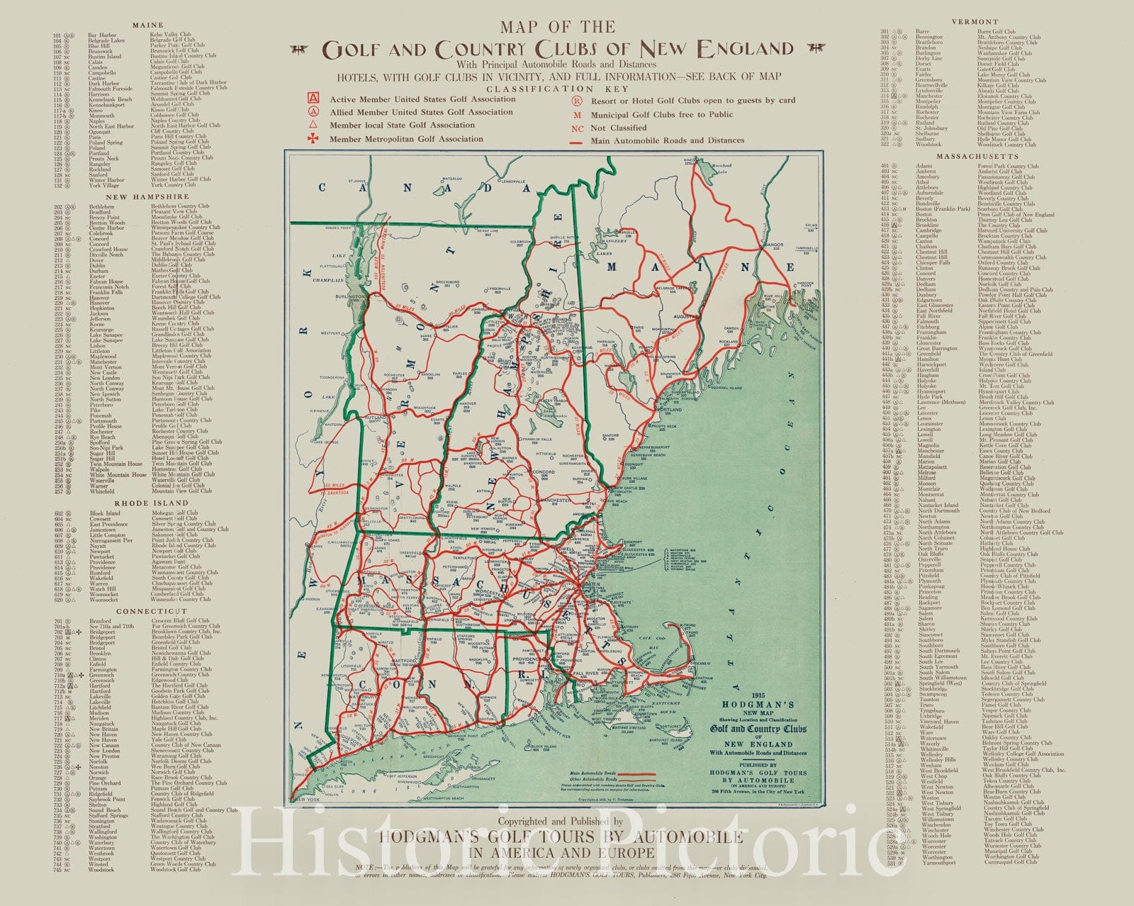 Historical Map, 1915 Hodgman's new map showing location and classification golf and country clubs of New England with automobile roads and distances, Vintage Wall Art