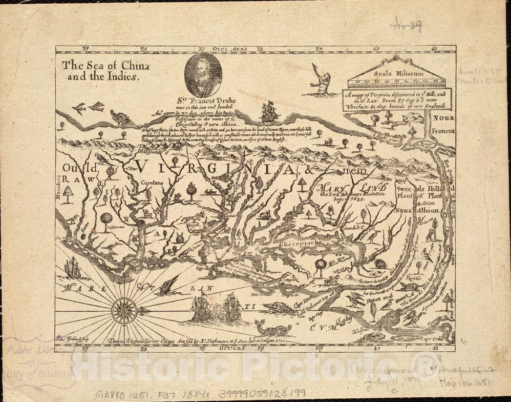 Historical Map, c.1884 A mapp of Virginia discouered to ye Hills, and in its latt: from 35 deg: & 1/2 neer Florida, to 41 deg: Bounds of New England, Vintage Wall Art