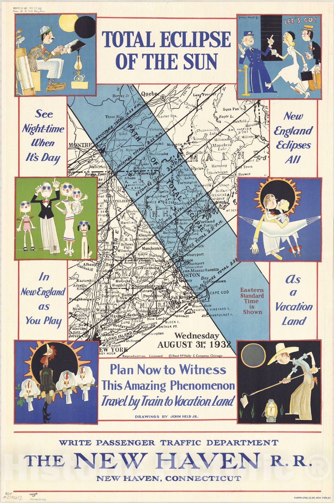 Map : New England 1932, Total eclipse of the sun : see night-time when its day in New England while you play, New England eclipses all as vacation land