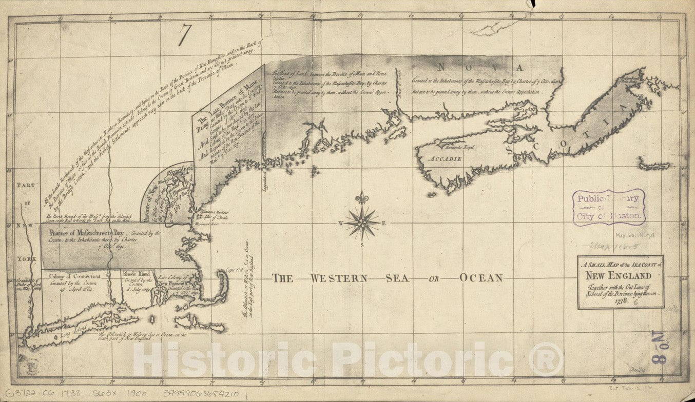 Historical Map, A Small map of The sea Coast of New England Together with The Outlines of Several of The Provinces Lying thereon, 1738, Vintage Wall Art